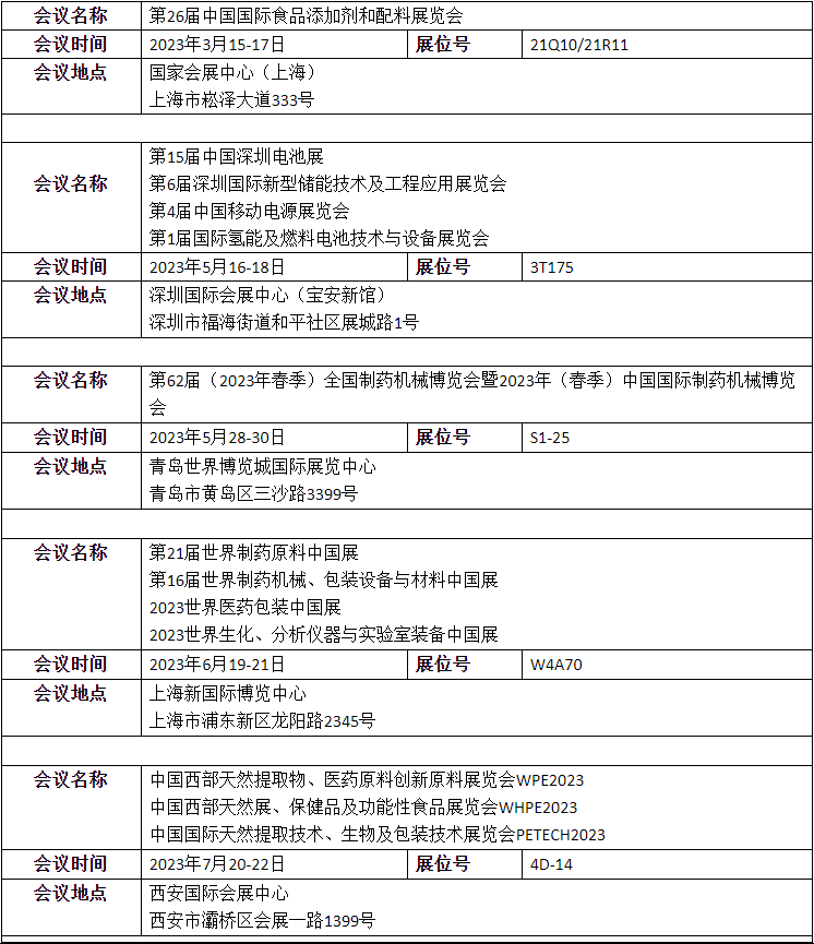 2023所參的展會覆蓋多個行業(yè):醫(yī)藥、食品、化工、電子化學(xué)品、新能源等。
